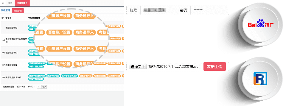 CRM系統根據百度推廣提供的API接口直接獲取數據,快捷、方便更簡單,只需在學校管理中添加百度賬戶賬號密碼即可使用。
